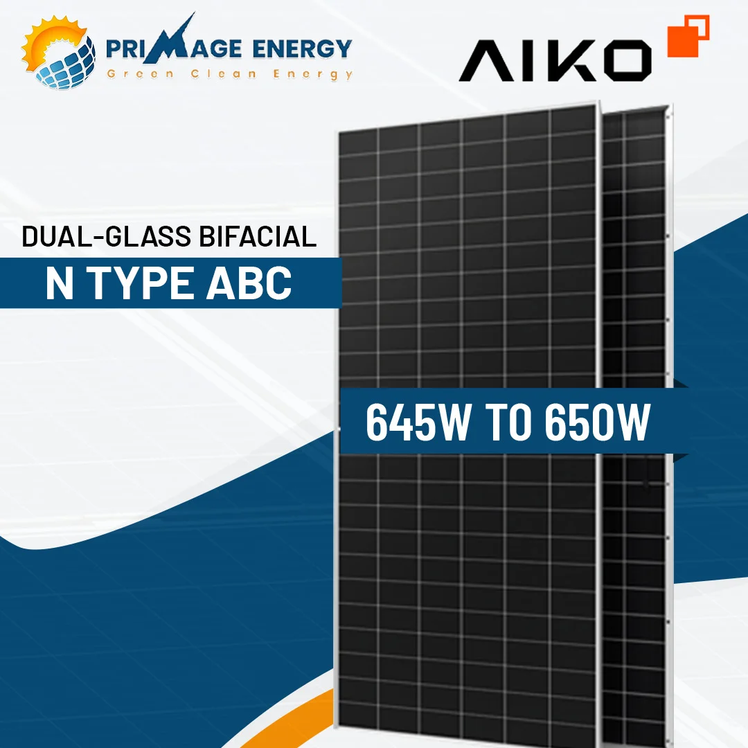 The Aiko 645-650 is a series of high-efficiency, n-type ABC (All Back Contact) solar panels. The “645-650” in the name refers to its very high power output class, meaning these panels typically produce between 645 to 650 watts of power under standard test conditions.